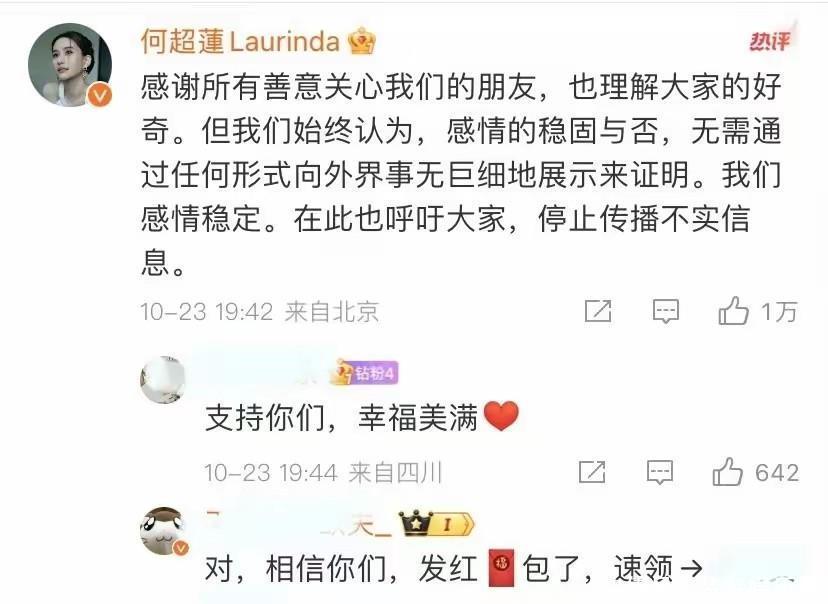 直到10月23日,夫妻二人终于联手出击。窦骁的声明斩钉截铁,何超莲的回应坚定有力。短短半小时,评论区涌入数万条留言,网友盛赞“这才是夫妻该有的样子”。